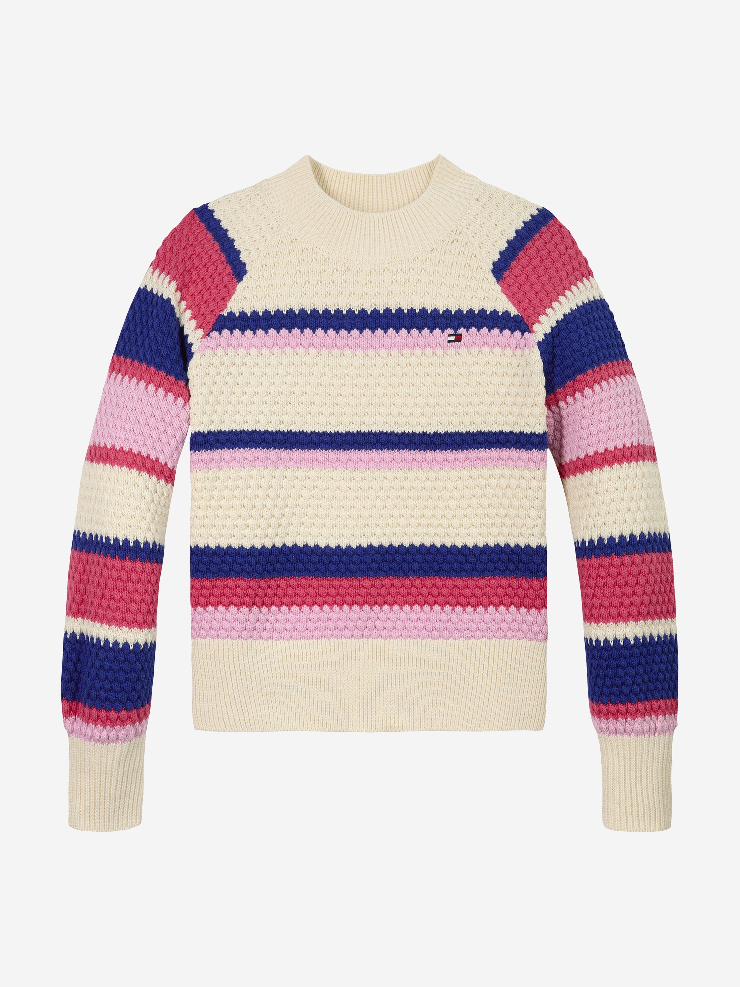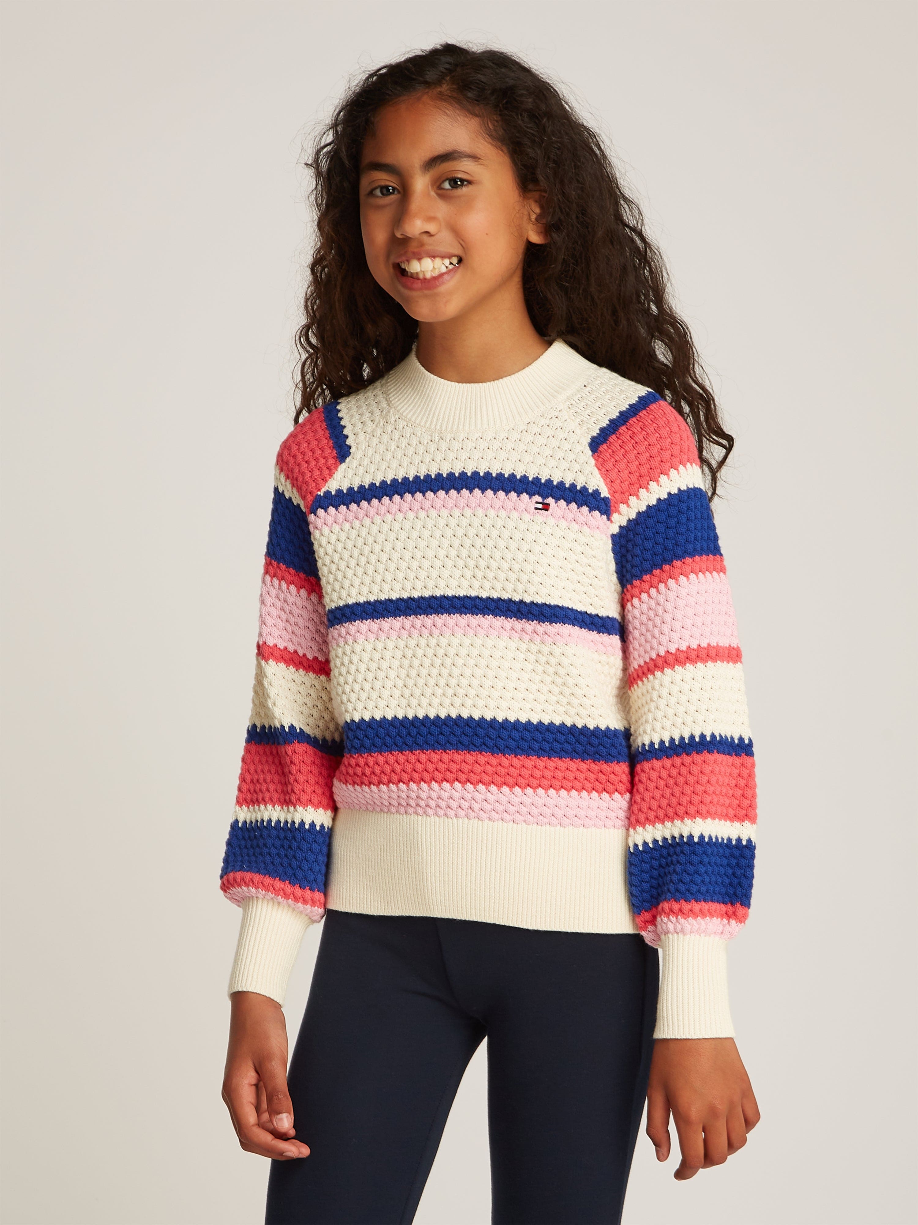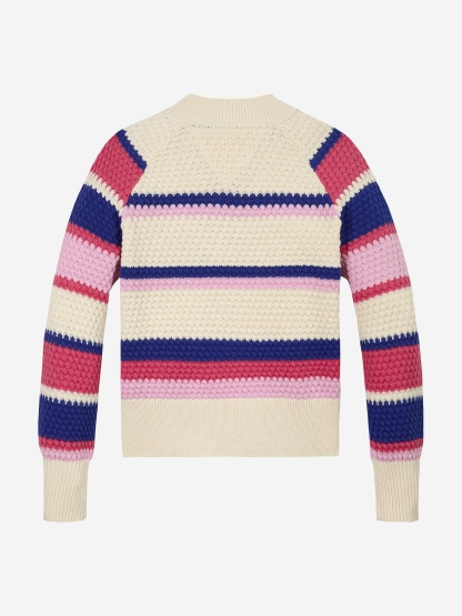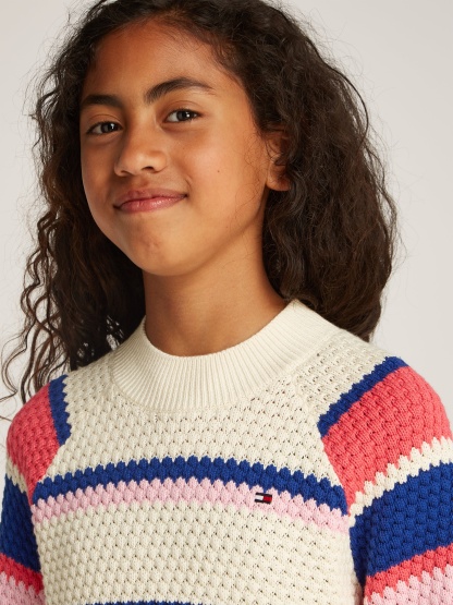 Introducing the Tommy Hilfiger Girls Striped Jumper in Multicolour—a stylish staple for SS2025. Infused with charm and vibrancy, this jumper is a delightful addition to any young lady's wardrobe. Key features include: